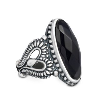 The glitz and glamour of Big Texas life inspired the creation of this richly romantic treasure! A beautifully faceted black onyx gemstone takes the spotlight in this stunning piece, but it's the intricate silverwork that's most noteworthy. Bordering the stone is an oxidized silver beaded border that blends into a lovely openwork heart design. This is a casually elegant ring that goes with abso